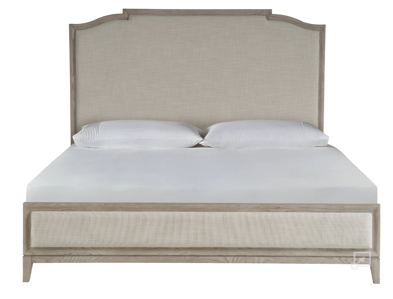 The Coleman Panel Bed showcases a chic, slightly scalloped frame paired with plush upholstery, presenting a luxurious yet inviting centerpiece for the bedroom.