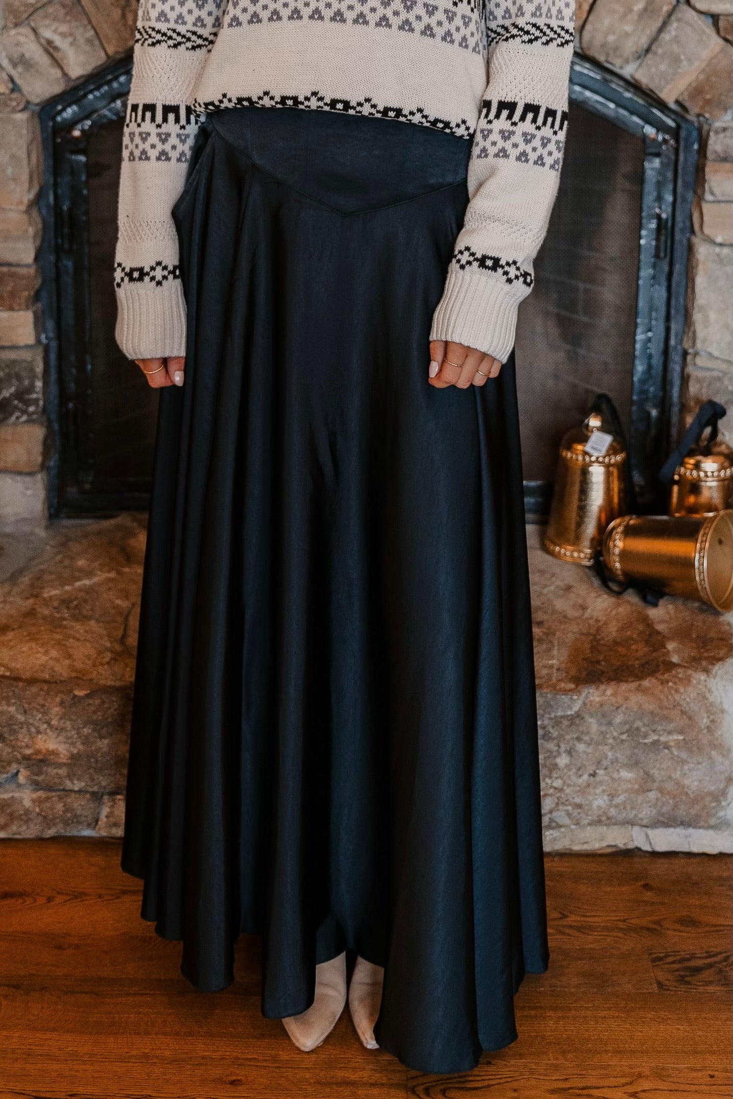 Stunning is an understatement for this satin maxi skirt, featured in a cascading A-line design with a pointed waistband for an extra elevated detail.