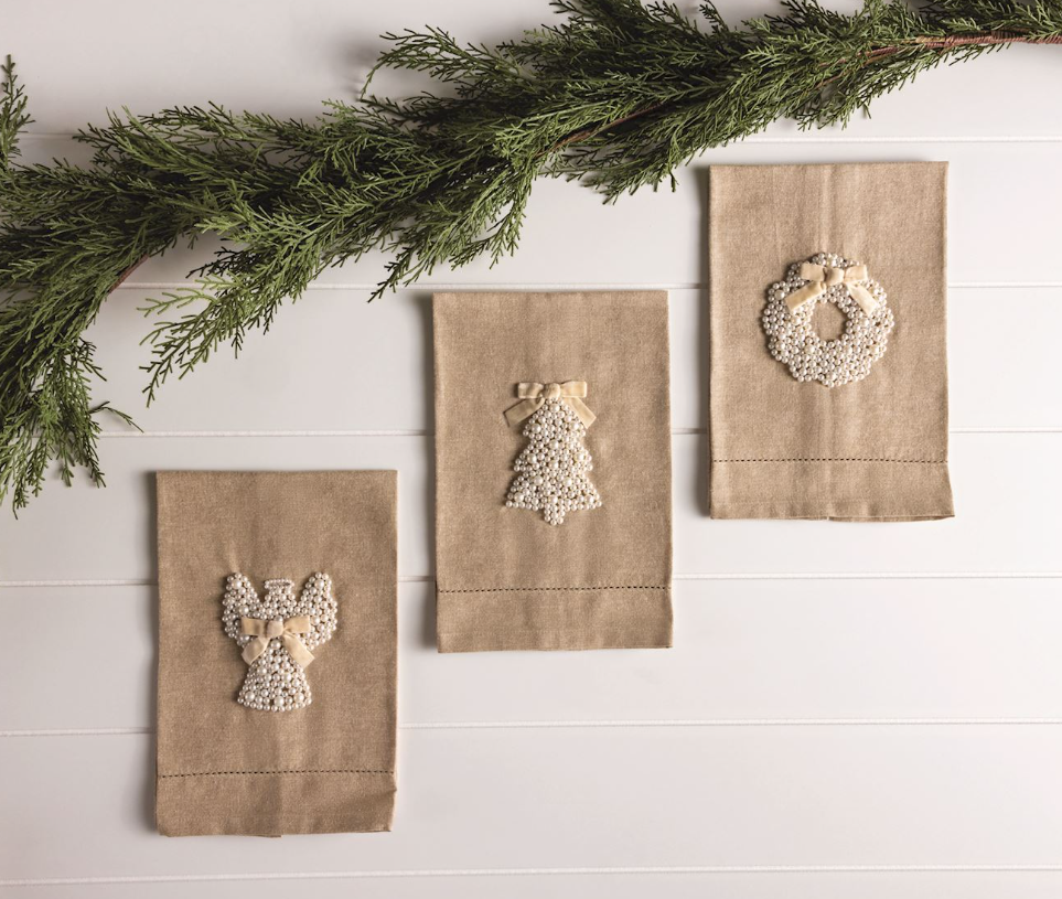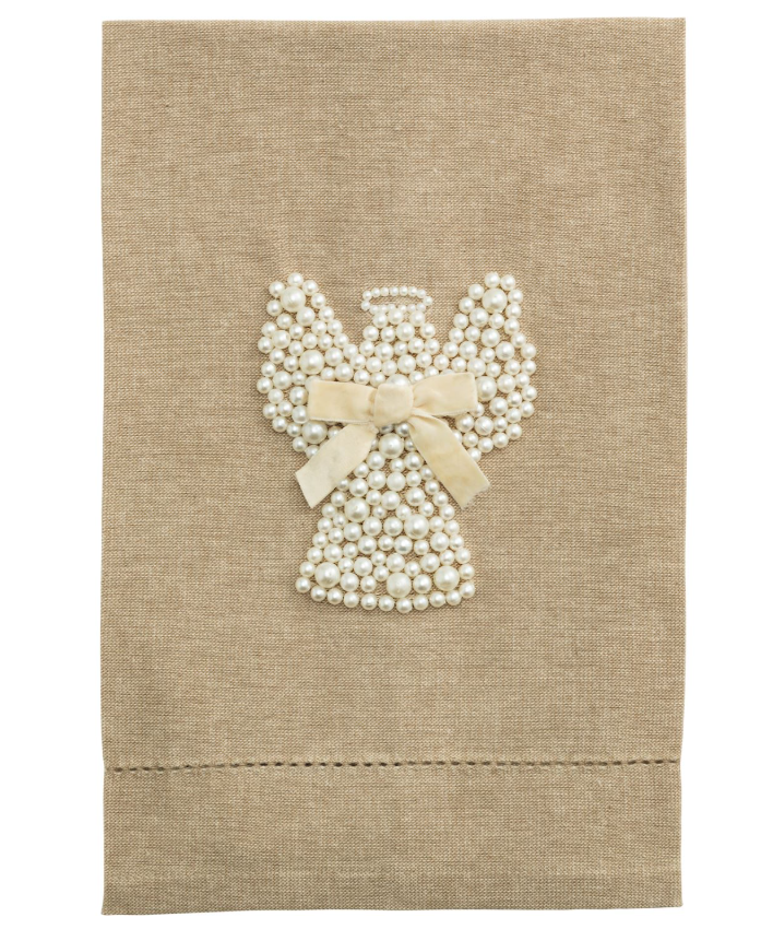 Chambray hand towel features pearl bead appliqué with velvet bow and hem stitching.
