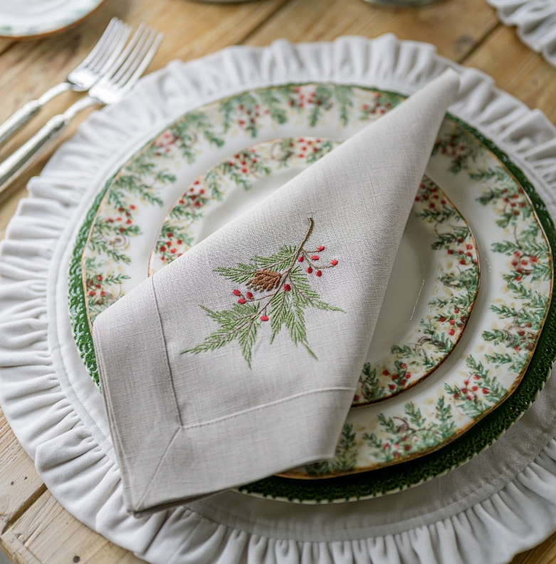 - Pine Berry Embroidered Linen Napkins - Set of 4