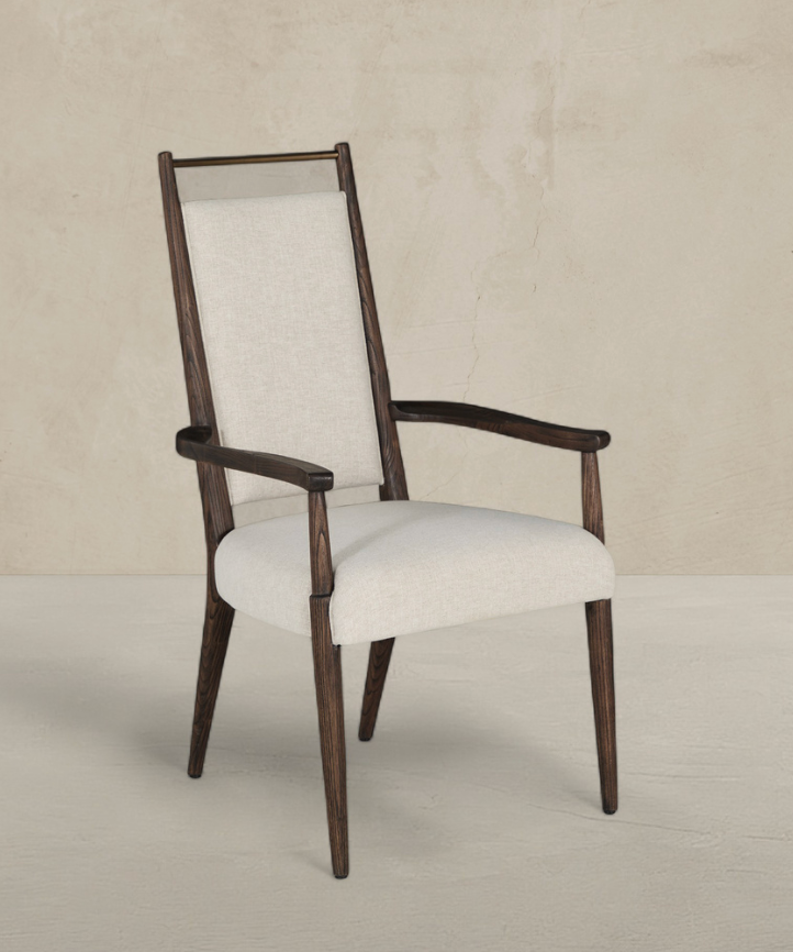 The Highland Dining Arm Chair in Dusk captures modern elegance with its sleek lines and contrasting tones. Built from oak in a deep Dusk finish, the chair’s clean form is softened by the light Slipaway Sand performance upholstery. The high backrest and padded seat provide exceptional comfort, while the brass-toned accent bar lends a subtle, elevated touch. Designed for versatility, this side chair transitions seamlessly from casual meals to sophisticated entertaining.