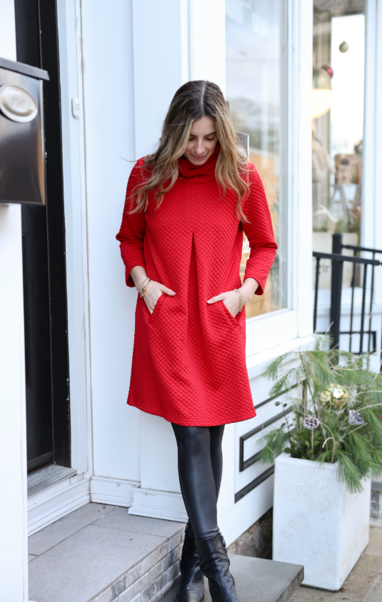 Say hello to The Vickie – the cozy upgrade to your favorite Meghan dress! Made in soft quilted fabric, this dress is as flattering as it is comfy. With a loose turtleneck, front pleat, 3/4 sleeves, and (our favorite) pockets, it’s your new go-to for fall layering, casual chic days, or nights out in style. Pair it with tights and booties or leggings and sneakers for effortless comfort-meets-fashion.