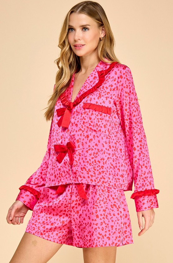 Leopard-printed ruffled long-sleeve pajama set with accented bow ties and side pockets.