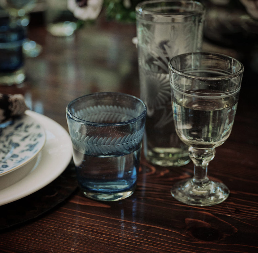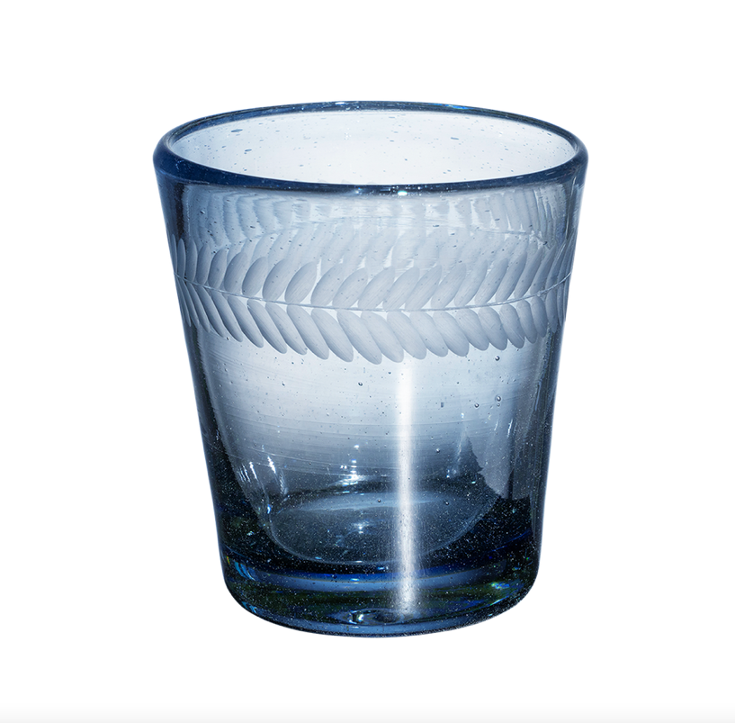 Blue colored double old-fashioned mouth blown glass with hand engraved tight cadena laurel