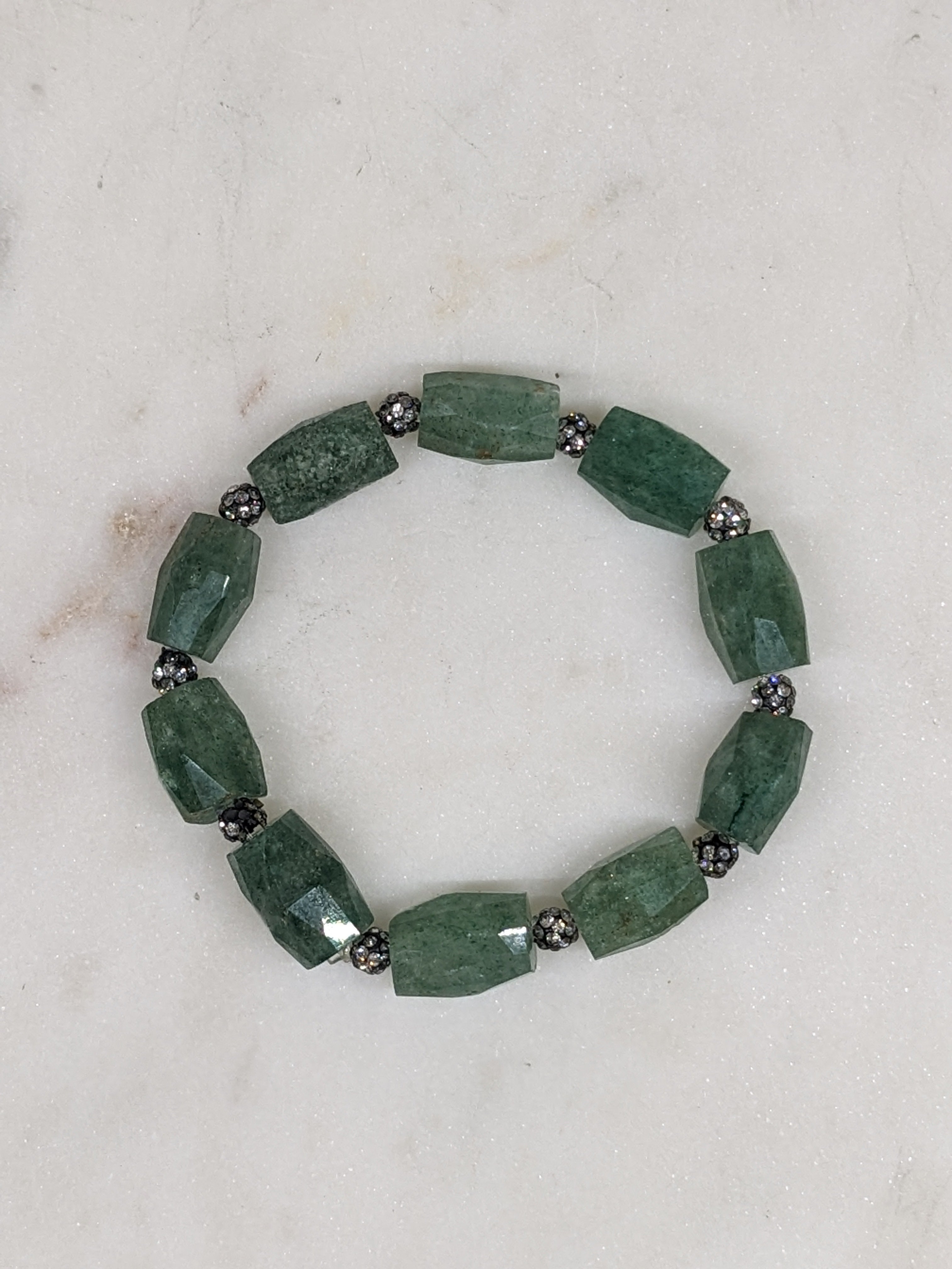 Green strawberry quartz in a faceted barrel shape with pave crystal accent beads. On clear stretch nylon.