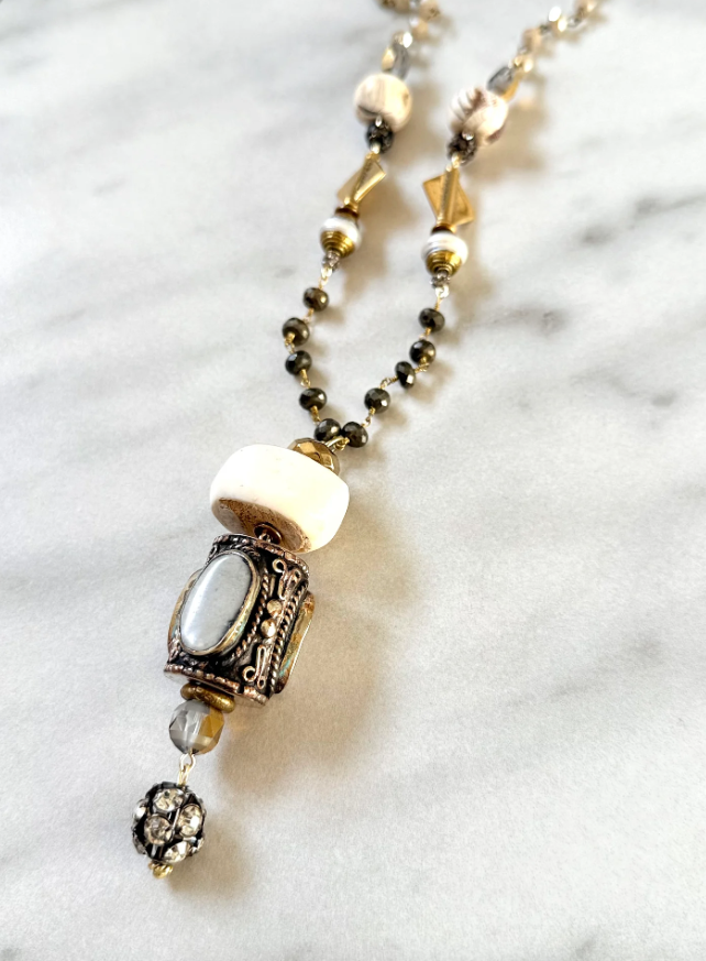 Beautiful Tibetan silver bead inlaid with shell, finished with bone, Tibetan pearls, African brass, and Austrian crystal on pyrite bead chain.