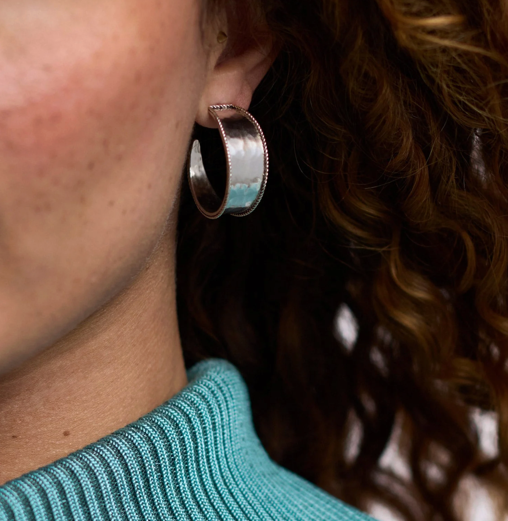 Lightly hammered hoop that elegantly curves from wide to narrow, finished with with twisted wire detail.