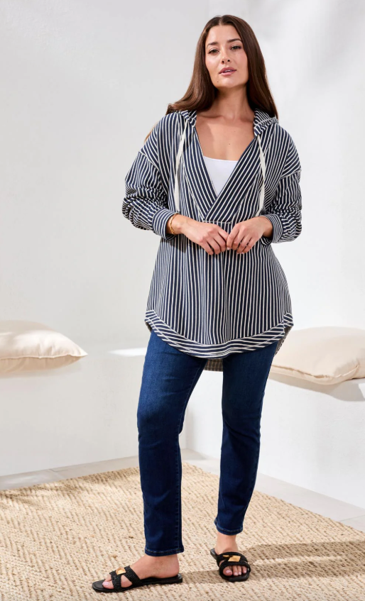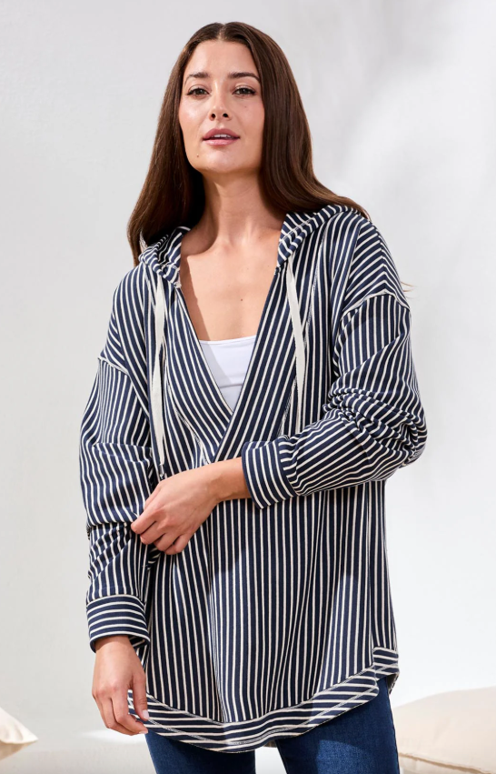 Tribal Stripe French Terry Hooded Top w/ Curved Hem