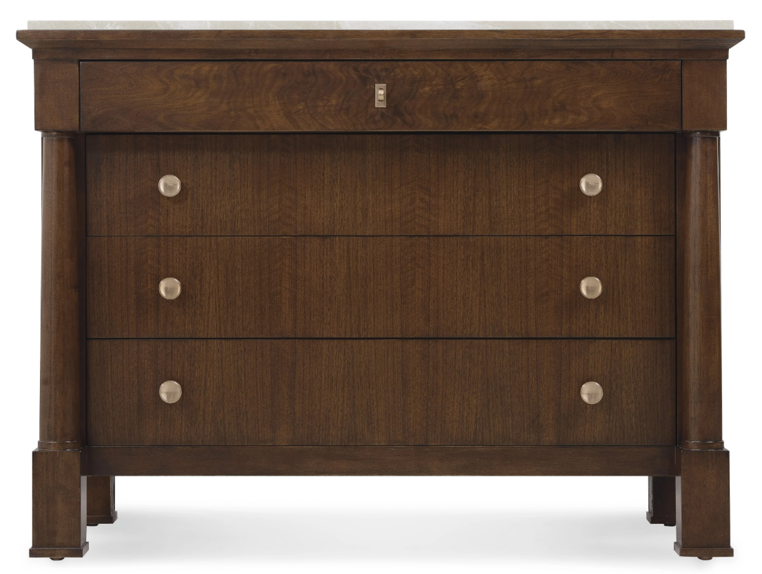 Add practical elegance to your bedroom with the Archives Four-Drawer Chest. Crafted with a Classic Walnut finish over figured quartered walnut veneers, this chest exudes timeless charm. It features four drawers, including cedar-lined bottom drawers, and is topped with a Castle Grey marble surface. The custom satin brass hardware completes the luxurious look of this beautifully designed chest.