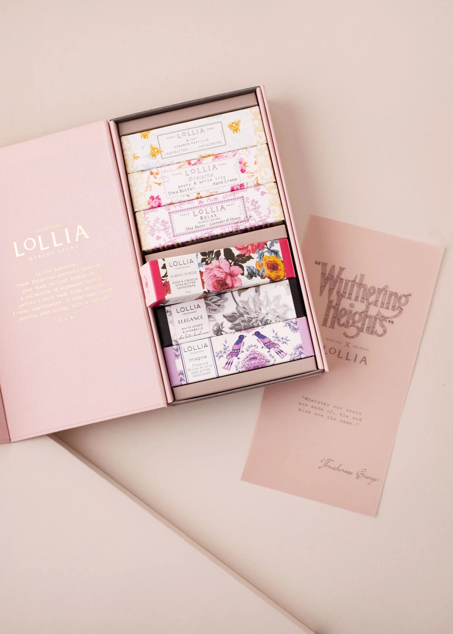 Uncover true love in the "Wuthering Heights" x Lollia Handcreme Discovery Set. Experience luxuriously smooth skin as decadent Macadamia Nut & Avocado Oils meld with creamy Shea Butter & Aloe to envelop skin in lush moisture, leaving hands tantalizingly touchable. A sumptuous treat for the most enchanting vanity, explore the captivating possibilities found within this collection of alluringly scented, purse-size handcremes—made from only the finest ingredients for skin that’s deliciously silky, soft, and radiant.