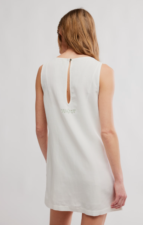 Timeless and 70s-inspired, this classic mini dress features a lightweight cotton-blend fabric, a breezy shift silhouette, and embroidered detailing for a sweet finish.