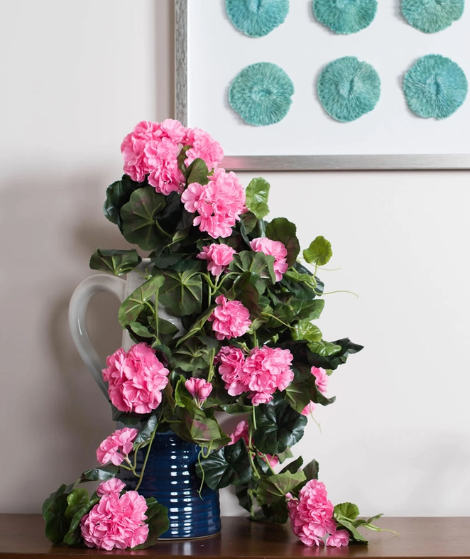 29" Artificial Pink Polyester Geranium Hanging Bush and Vines with 128 Leaves, 232 Flowers and Buds. This Bush is made of maintenance free polyester and will retain its vibrant color for years to come.