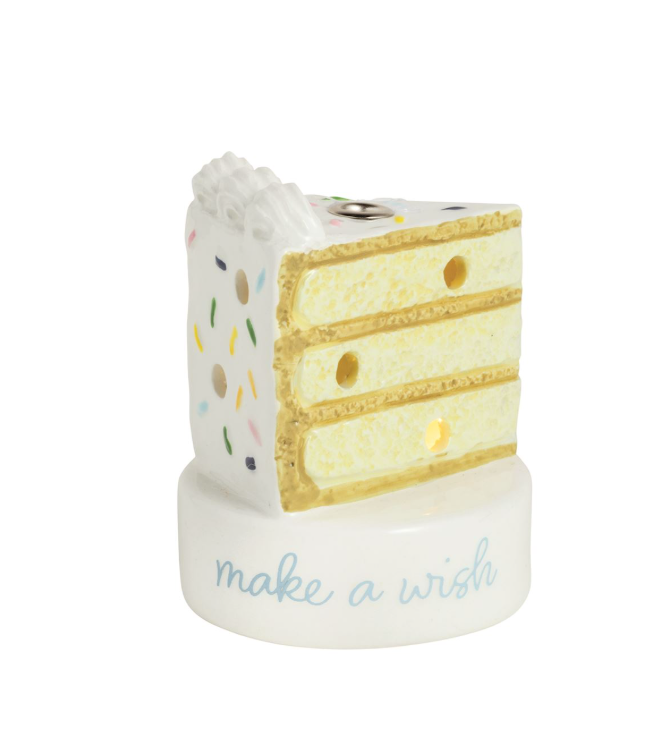 - Hand-painted ceramic sitter with LED lights has well to hold birthday candle and plays "Happy Birthday" tune.