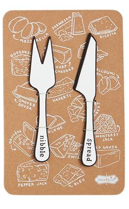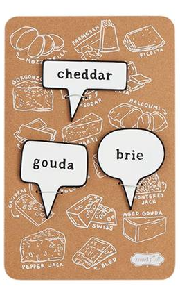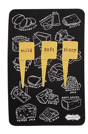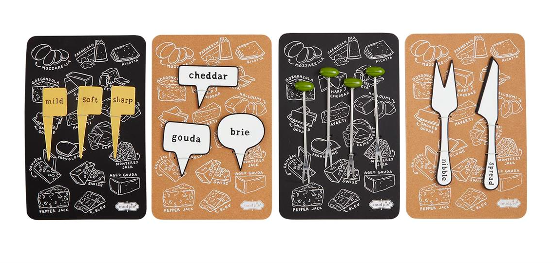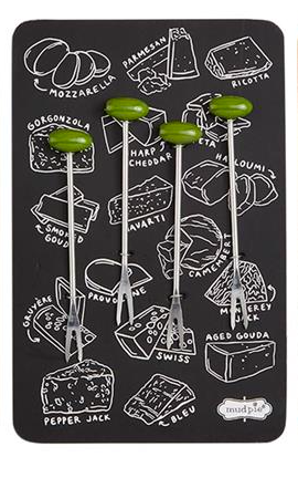 Set of metal cheese markers, olive picks or utensils on kraft display card.