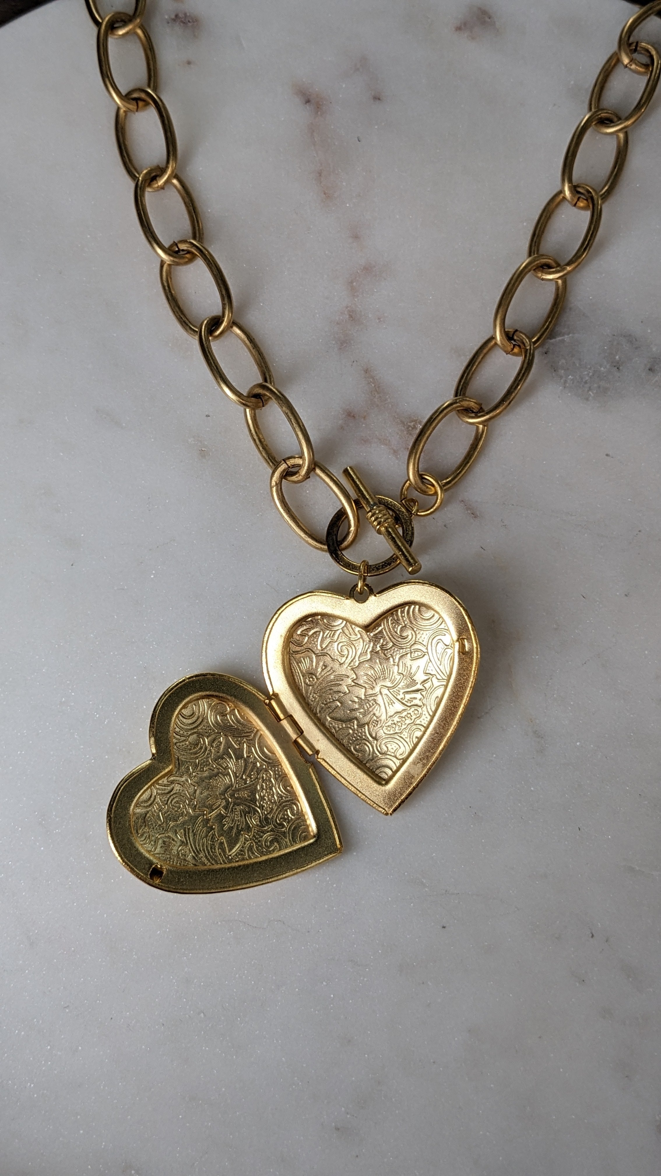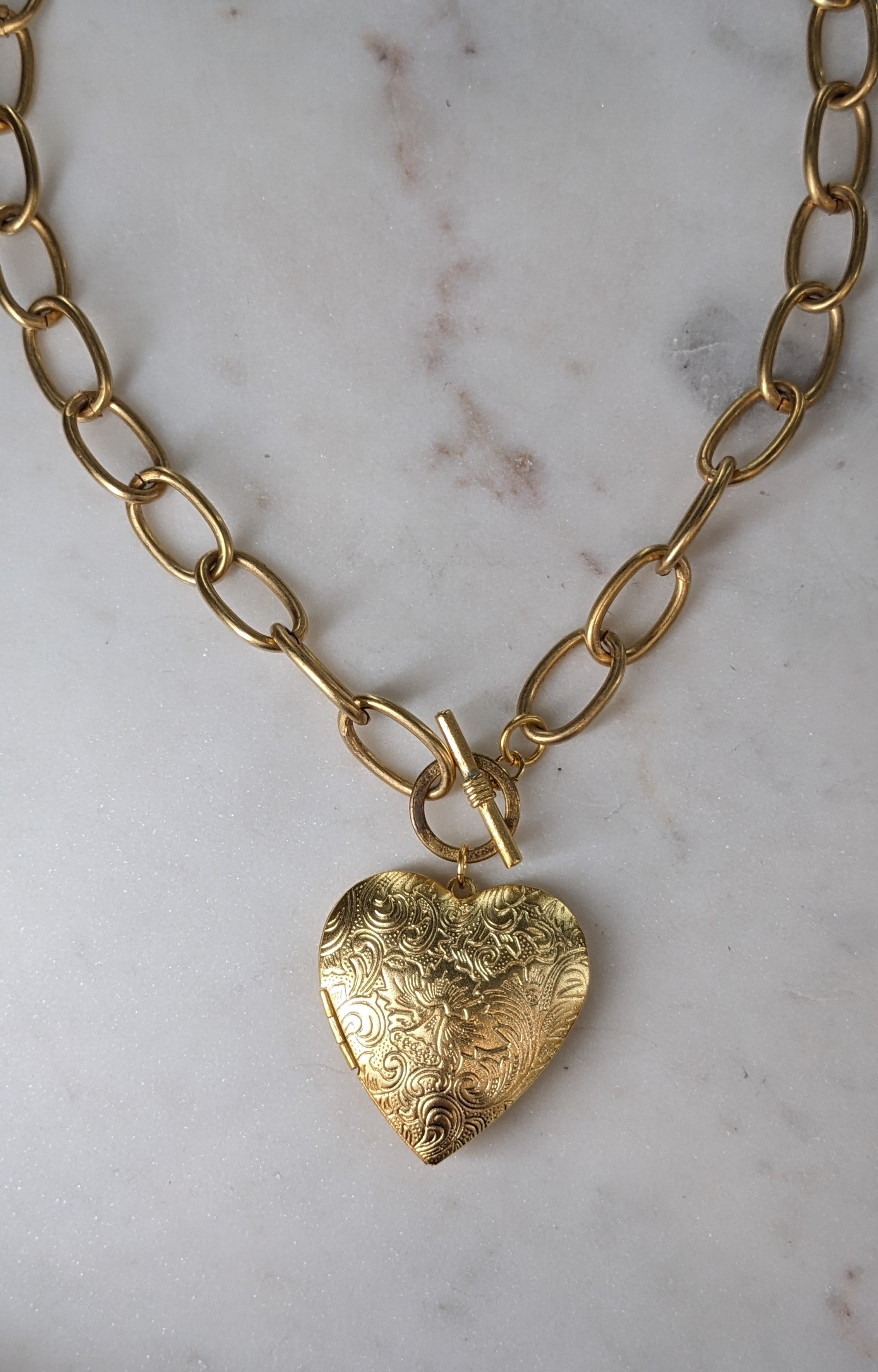 Large baroque heart locket on gold link toggle chain