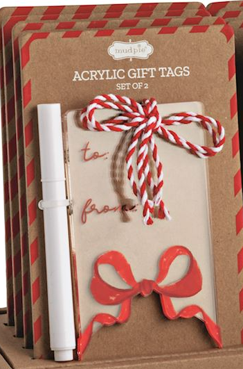 Two reusable acrylic gift tags with twisted cotton rope. Comes on display card with marker. Marker wipes away for tags to be used again and again!