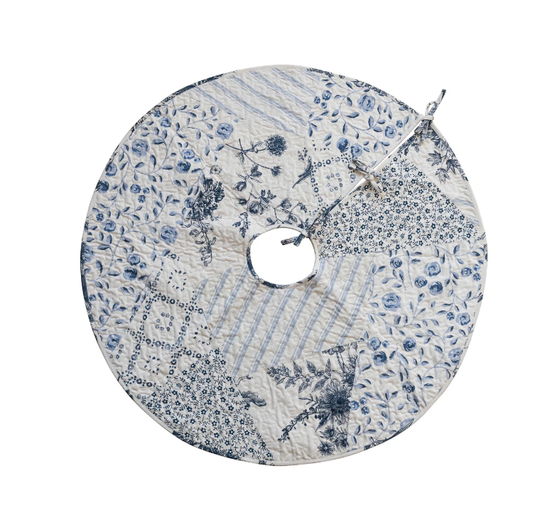 48" Round Quilted Cotton Patchwork Floral Tree Skirt, White & Blue